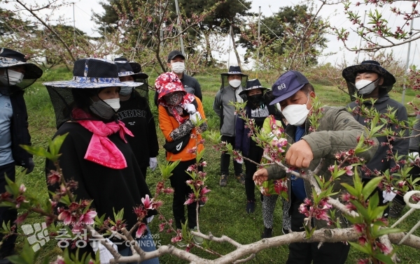 홍성군의회는 23일 코로나19로 일손이 부족한 금마면 죽림리 소재 박태진 농가를 찾아 고품질 복숭아 생산의 첫 단계인 적화(꽃따기) 작업을 전개하며 구슬땀을 흘렸다.