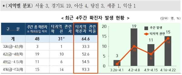 특히, 최근 한달 간 확진된 48명 중 31명(64.6%)이 타지자체 관련 감염자로 나타나 누계 환산 시 비율(34.7%) 보다 약 2배 높은 수치를 보였으며,