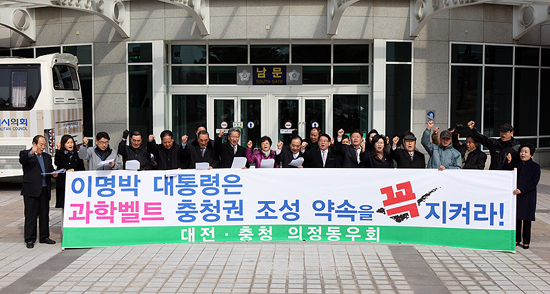 이날 시 의정회는 “이명박 대통령이 신년 방송좌담회에서 국제과학 비즈니스 벨트 충청권 입지 공약 백지화를 공식 선언했다”며 “이는 우리 500만 대전충청인을 기만하고 우롱하는 용납할 수 없는 행위로, 우리는 세종시 수정안에 이어 이를 대충청권 제2의 선전포로로 간주한다”고 말했다.,