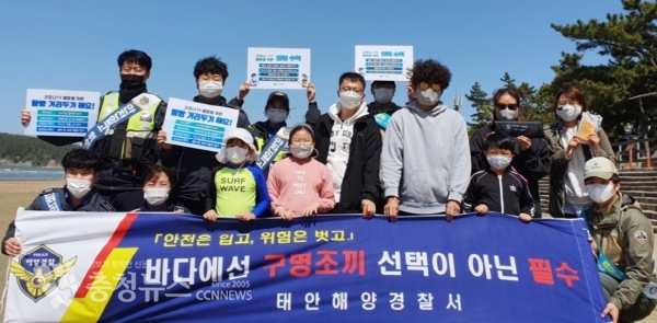 이날 태안 몽산포 해변 일대에서 ‘안전은 입고, 위험은 벗고’, ‘바다에선 구명조끼, 선택 아닌 필수’란 표어가 적힌 어깨띠를 두루고 구명조끼 착용의 중요성을 널리 알리는 한편, 휴대폰 방수팩, 호루라기, 연안사고 예방 행동요령을 담은 홍보물품을 나눠주었다.