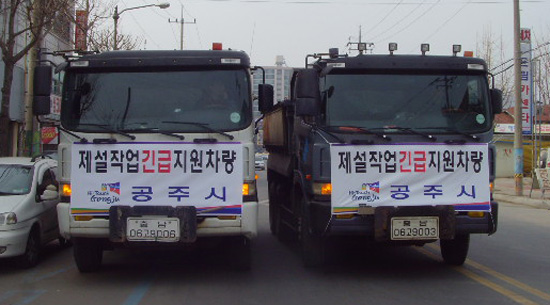 시는 16일 오후, 폭설 피해지역인 강릉시로 15t 덤프트럭 2대, 모래 살포기 1대, 염화칼슘 15t(600만원 상당), 지원인력 3명 등을 보내고 오는 3월경에는 2차 피해복구 지원을 위해 공무원과 자원봉사자 등으로 구성된 복구지원단을 파견, 피해 비닐하우스 등의 철거에 나설 계획이다.
