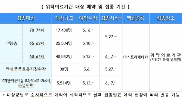 5~6월 접종 대상은 ▲60~74세 어르신, ▲만성중증호흡기 질환자, ▲유치원‧어린이집‧초등교사(1~2학년) 등 총 90,270여명으로, 천안시 전체 인구의 약 13%에 해당한다.