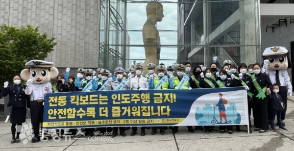 천안동남경찰서(서장 총경 백남익)는 11일 신부동 시외버스 터미널 앞에서 천안시, 동남녹색어머니회, 동남모범운전자회, 삼운회 교통봉사대 등 50명이 참석한 가운데 코로나19 방역수칙을 준수하며 개인형 이동장치(PM) 도로교통법 개정을 앞두고 홍보를 위해 합동 캠페인을 펼쳤다.