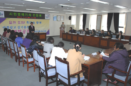 충청남도 공주시는 22일 오전 공주시청 소회의실에서 열린 시민명예기자 간담회에서 이준원 공주시장을 비롯 시민명예기자 30여명이 참석, 시정을 바라보는 솔직한 의견과 함께 시정지 활성화 방안에 대해 심도깊은 논의를 벌였다.