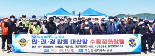 태안해양경찰서(서장 성창현)는 소속 경비함정 1507함 주관으로 18일 오후 서산시 대산읍 대산항 전용부두 일대에서 평택해경 대산파출소, 충남도청 해양정책과, 서산시 해양수산과, 대산지방해양수산청 해양수산환경과, 해양환경공단 대산지부, 해양구조협회 경기충청북부지부 등 관계자 50여 명이 참여한 가운데 "민‧관‧경 합동 수중정화 활동을 펼쳤다"고 밝혔다.
