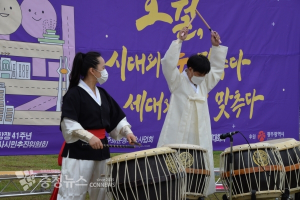 성은정 세종참여연대사무처장의 사회로 진행된 이날 기념행사는 세종문화원(유일상, 김기숙, 김지영)모듬북시나위 ‘하늘이여’ 공연과 묵념후 ‘임을 위한 행진곡’을 합창했다.