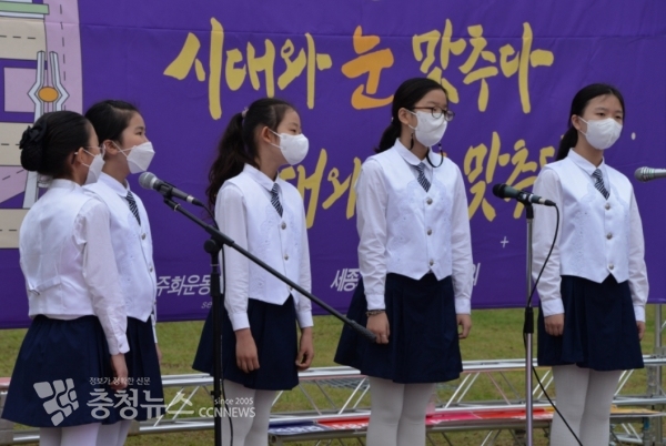 이어 세종시 재능시낭송협회 김재순, 이재일 씨의 '5.18 시낭송'과 사계절 어린이합창단이 미얀마 언어로 부른 '진실은 침몰하지 않는다'와 '아름다은 세상'이 연주되면 행사 참석자들의 감동을 선사했다.