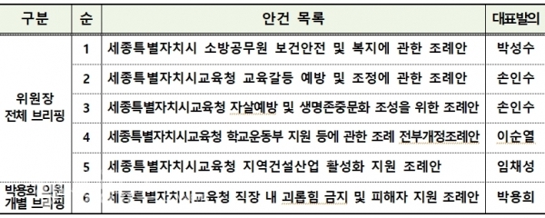 교육안전위원회 소관 의원발의 조례안 6건에 대한 주요 내용은 다음과 같다.