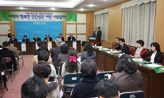 대전시의회(의장 이상태)는 24일 의회 4층 대회의실에서 행복한 학교를 만들기 위한 올바른 정책개발과 대전교육 문화 창조를 위해 ‘미래교육연구회 창립 정책포럼’ 을 개최했다고 밝혔다.