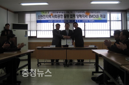대전 대덕구 신탄진동주민센터(동장 현석무)는 28일 동주민센터에서 신탄진동새마을협의회(회장 홍해표)와 대전조차장관리역(역장 최석인) 상호간에 신탄진지역 사회공헌 활동을 위한 협약식을 체결했다.