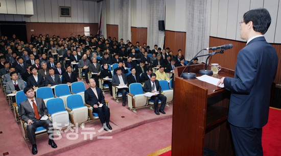 안희정 충남지사가 2일 도청 대강당에서 열린 직원모임에서 구제역 종식을 위해 노력하고 있는 직원들의 노고를 위로하면서 ‘변화된 시대에 맞는 도정을 구현하자’고 주문했다.