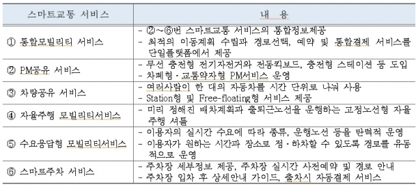 통합 모빌리티 앱, 자율주행 모빌리티, 차량공유 서비스 등 교통분야 총6개 스마트서비스 구축