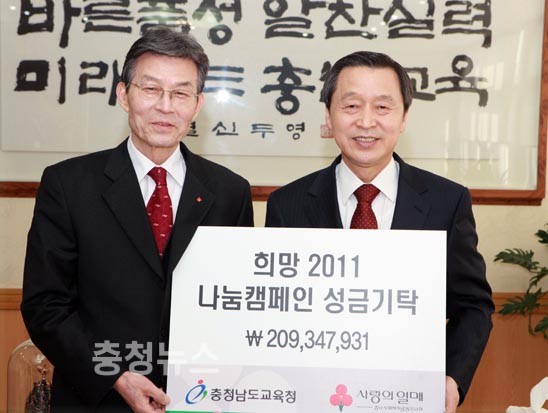 충남교육청(교육감 김종성)은 3일 '희망 2011 나눔캠페인'과 연계한 도내 저소득층 가정 학생 돕기 일환으로 모금한 성금 209,347,930원을 충남사회복지공동모금회(회장 신한철)에 기탁했다.
