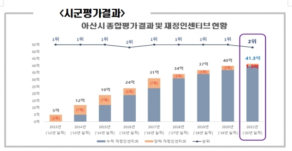 아산시가 2013년부터 지원받은 재정 인센티브는 총 41억3천만 원이며 ▲외암대로(대로3-5호) 확포장공사, ▲천안•아산 복합문화정보센터 조성사업, ▲장애인 국민체육센터 건립사업, ▲청소년 문화의 집 건립사업, ▲아산둘레길 조성사업, ▲아산시 육아종합지원센터 건립, ▲은행나무길 생육환경 개선사업 등 그동안 아산시민들의 정주여건 개선을 위한 사업선정을 통해 문화•체육•육아 등 각 분야의 복지 향유 기회를 확대하였으며, 이번에 확보된 1억3천만원은 2022년 현안 사업 재원으로 활용할 계획이다.