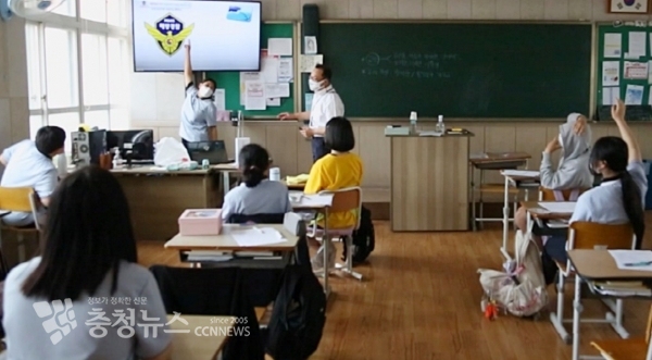 원이중학교 참여신청 학생들의 적극적 호응 속에 태안해경 이성일 홍보실장이 해양경찰 진로특강을 진행하고 있다. 사진=태안해양경찰서