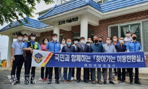 태안해양경찰서(서장 성창현)는 정부혁신 실행계획과 적극행정 일환으로 나눔문화 지역확산과 민원서비스 만족도 향상을 위해 8일 서산시 팔봉면 구도 호리마을을 찾아 “이동 민원실”을 운영했다.
