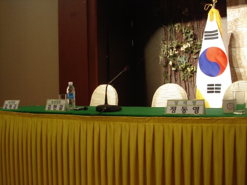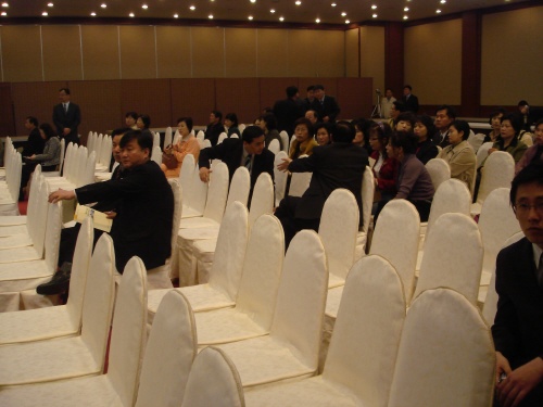 오페라웨딩에서 열린 행복도시건설 주민간담회장의 썰렁한 분위기. 정동영 당의장과 염홍철 시장 등 주요 인사들이 행사 시작 후 30분이
