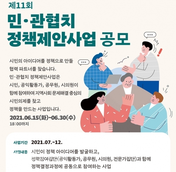 공익적 시민활동을 지원하는 천안NGO센터는 시민의 아이디어를 정책으로 만들어 모두가 행복한 천안을 만들기 위해 15일 ~ 30일까지 15일간 “제11회 민‧관협치 정책제안사업 공모”를 실시한다.