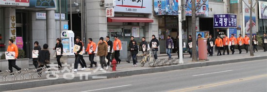 ▲ (주)진로 오렌지색퍼포먼스팀과 직원들이 플래시몹을 위해 이동하고 있다.