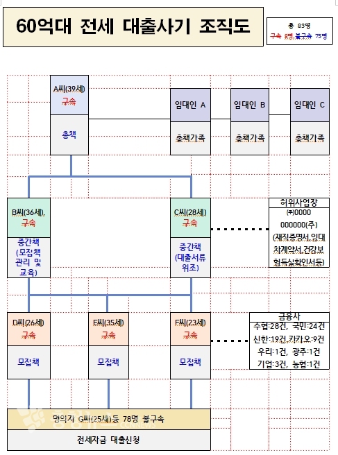 A씨 등 사기단은 이를 악용하여 각자 역할을 분담, 무주택 청년층들을 SNS 등을 통해 모집, A씨 가족들 명의 건물 세입자로 둔갑시켜 금융기관으로부터 전세 대출을 받아내는 일명 작업대출 수법으로 64억 상당의 대출금을 편취하거나 무직인 청년들을 허위사업체 근로자로 만들어 신용대출도 받게 한 혐의도 받고 있다.