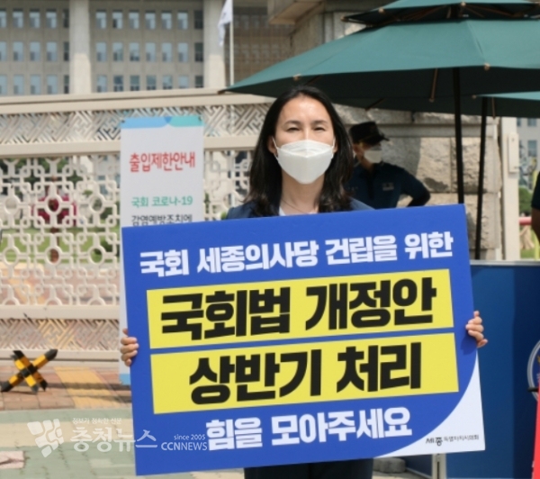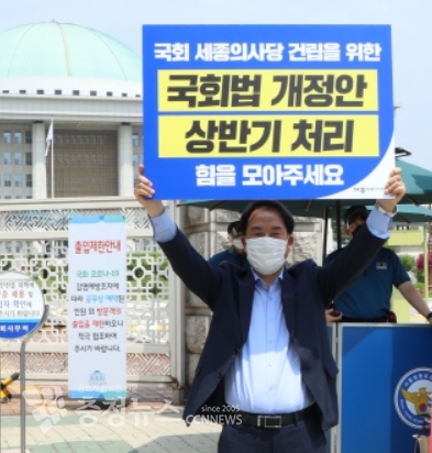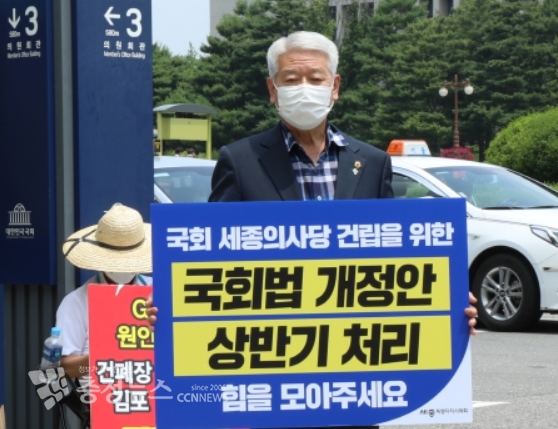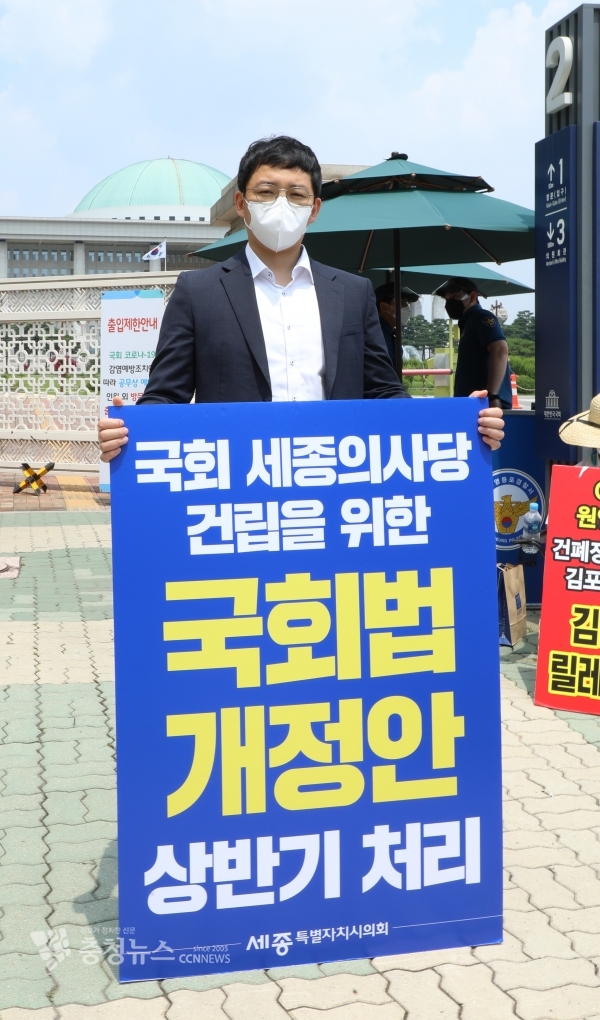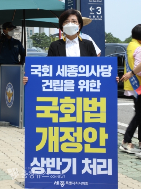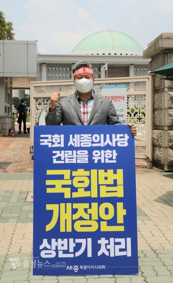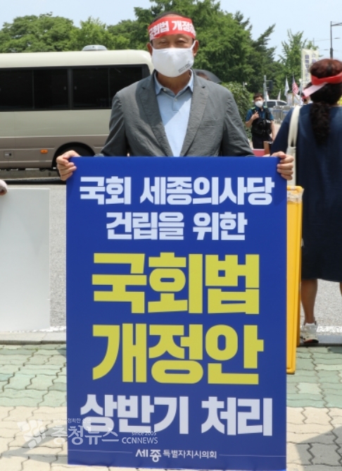 세종시의회 행정수도완성특별위원회가 24일 여의도 국회의사당 앞에서 국회법 개정을 촉구하기 위한 1인 릴레이 시위를 벌였다.
