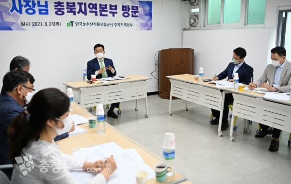 한국농수산식품유통공사(aT) 김춘진 사장은 24일 공사 충북지역본부를 방문해 올해 주요업무 추진현황을 보고받고 현안사항을 점검했다.
