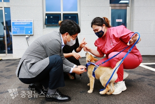 맹정호 서산시장이 서산시동물보호센터 1호 반려견에 인식표를 다는 모습