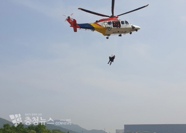 중부지방해경청 회전익 항공대 항공구조훈련장에서 항공구조 훈련 중인 태안해경구조대 사진=태안해양경찰서