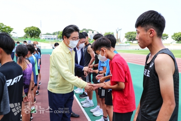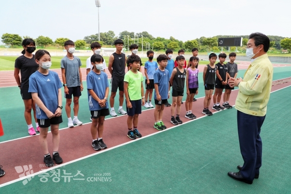김홍장 당진시장은 2일 당진시에서 개최하는 2021 충청남도 체육대회를 대비해 대표로 출전하는 육상 꿈나무 선수들 격려에 나섰다.