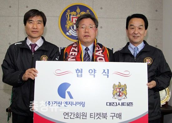 한편 지역건설에 앞장서고 있는 기산엔지니어링도 축구특별시 부활에 힘을 보탰다. 기산 엔지니어링 강도묵 대표이사와 대전시티즌 김윤식 사장은 지난 21일 오후 대전시티즌 사무국에서 티켓북 구매 협약식을 가지고 적극적인 후원을 약속했다.