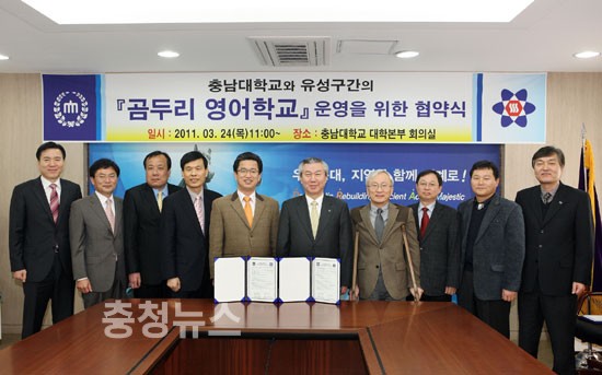 유성구는 24일 오전 충남대 대학본부 2층 회의실에서 허태정 구청장과 송용호 총장 등 양 기관 관계자들이 참석한 가운데 ‘곰두리 영어학교’ 운영을 위한 협약을 체결했다.