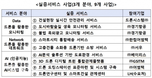 실증서비스는 3개 분야 9개 사업으로 드론을 활용한 모니터링, 네트워크, AI(인공지능) 서비스를 제공할 계획이다.