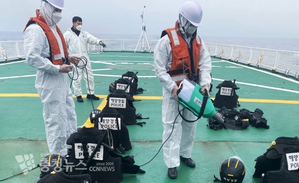경비함정 1507함 함미 갑판에서 경찰 단속 장비 등에 대한 자체 방역소독을 실시하고 있다. 사진=태안해양경찰서