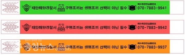 태안해양경찰서(서장 성창현)는 최근 해수욕장 이용자 손목에 채워주는 코로나19 안심 밴드에 ‘구명조끼 입기’ 홍보 문구와 비접촉 방문등록 ‘안심콜’ 전화번호를 넣어 신규로 1만부를 제작하고 태안군을 통해 배부를 시작했다.