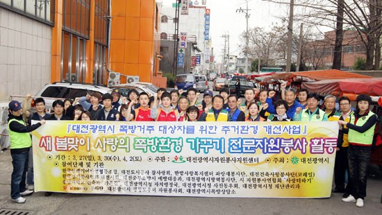 이날은 대전시와 대전시내 14개 전문봉사단체 회원 150여명이‘새봄, 사랑의 쪽방 환경 가꾸기’봉사활동을 펼치기 위해 동구 정동과 중구 은행동 쪽방촌을 찾았다.