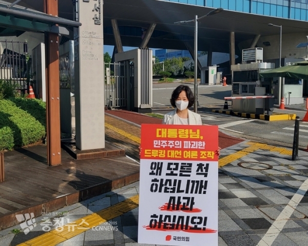 전 송아영 국민의힘 세종시당위원장(현 윤공정포럼 공동대표)이 5일 세종 국무총리실 비서실 앞에서 “대통령님, 민주주의 파괴한 드루킹 대선여론 조작 왜 모른척 합시까! 사과하십시오!”라는 피켓을 들고 1인시위에 돌입했다.