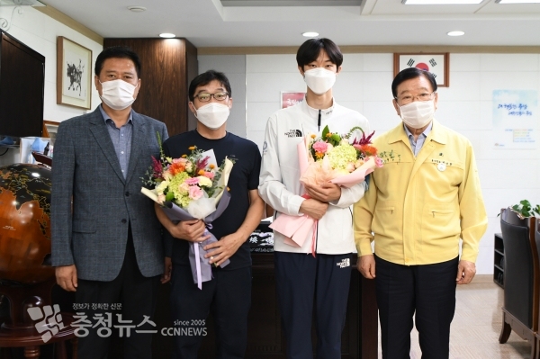 군에 따르면 지난 6일 도쿄올림픽 동메달리스트 장준 선수와 부친인 장인수씨, 그리고 장 선수의 은사인 송명섭 홍성고 태권도부 코치가 홍성군청을 함께 방문해 올림픽 대회 기간 내내 아낌없는 성원을 보내준 군민들에게 감사의 인사를 전했다.