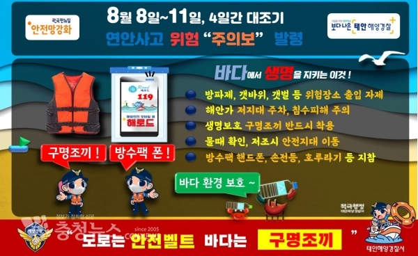 태안해양경찰서(서장 성창현)는 8일부터 11일까지 4일간 연안해역 안전사고 위험 ‘주의보’를 발령하고 바닷가 활동에 따른 안전사고에 각별히 주의해 줄 것을 당부하고 나섰다.