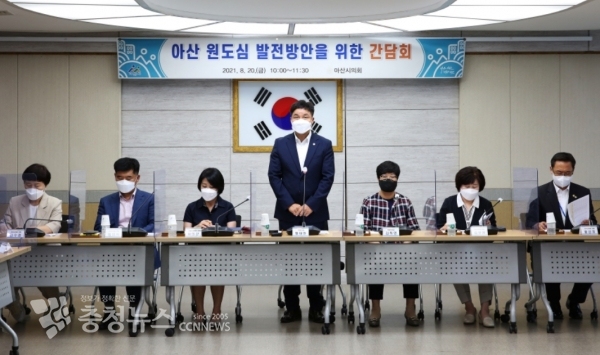 아산시의회(의장 황재만)는 20일 시청 상황실에서 ‘아산시 원도심 발전방안을 위한 간담회를 열었다.