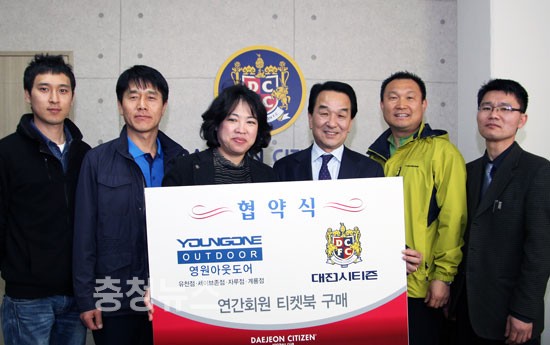 아웃도어 의류 전문업체인 영원아웃도어가 대전의 축구특별시 부활을 위해 힘을 모으기로 하고 13일 연간회원 티켓북 구매 협약식을 가졌다.