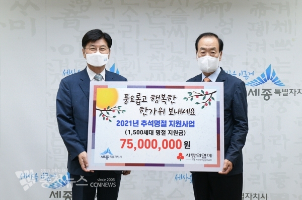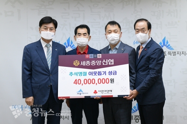 이날 전달식에서는 세종중앙신협이 성금 4000만원, LH세종특별본부가 명절식품으로 구성된 푸드팩 150세트(1500만원 상당)을 각각 기탁했다.