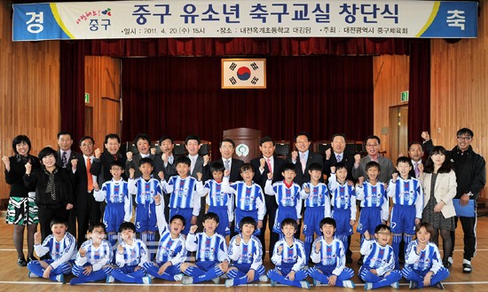 대전 중구(구청장 박용갑)는 20일 유소년의 체력증진과 학교체육 활성화를 위해 대전옥계초등학교에서 박용갑 청장, 권선택 국회의원, 진장옥 시체육회사무처장 등 내빈과 선수 및 학부모 등 100여 명이 참석한 가운데 '중구유소년 축구교실‘ 창단식을 가졌다.