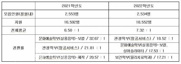모집분야 중 ‘관광학부(항공서비스)’ 전형이 18.52:1로 가장 높은 경쟁률을 보였으며 ‘문화예술학부(실용음악)-보컬, 싱어송라이터’ 전형이 17.53:1, ‘보건학부(물리치료학과)’ 전형이 17.21:1로 그 뒤를 이었다.