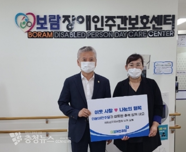 세종 을의 강준현 의원(세종시당 위원장)은 연서면 사랑의 마을(노인보호시설), 연동면 평안의 집(노인보호시설), 조치원읍 도원 장애인 보호작업장(장애인 자립 생활시설)에 성금을 기탁했다.