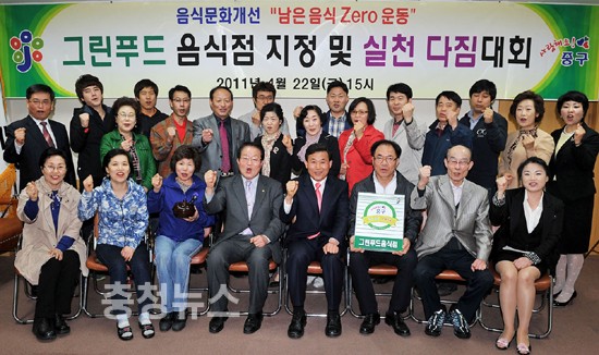 이날 박 구청장은 “자원을 절약하고 온실가스를 줄이는데 민․관이 하나 되어 녹색식생활 1번지 중구를 만들어 가야할 때”라고 강조하며 “먹을 만큼 제공하고 남은 음식은 포장해 줘 남은 음식 제로(Zero)운동을 확산시키는데 앞장서 줄 것“을 당부했다.
