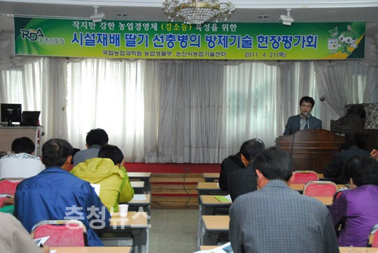 논산시(시장 황명선) 농업기술센터와 국립농업과학원은 공동으로 지난 21일 『녹비를 활용한 딸기선충병의 친환경적 방제기술』의 현장 적용 연구에 대한 평가회를 현장기술지원단과 농업인 등 관계자가 참석한 가운데 개최하였다.