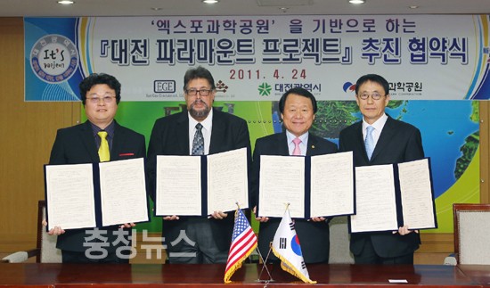 세계적 영화제작·배급업체인 파라마운트사의 한국내 독점적 개발 및 라이선스를 보유하고 있는 美 EGE(East Gate Entertainment, LLC)社와 대전시가 엑스포과공원내 ‘복합영상파크 조성을 위한 포괄적 협약’을 체결하고 EGE社 주관아래 본격적인 사업타당성 조사에 착수키로 했다.