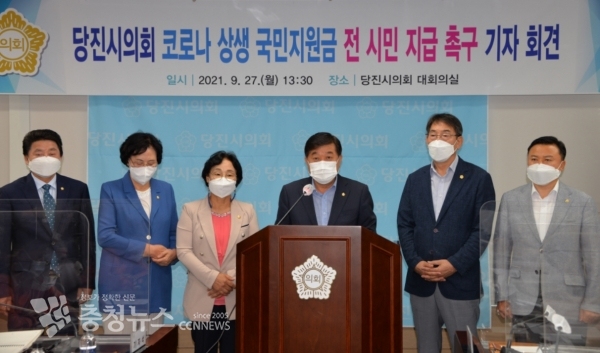 당진시의회 의원 일동은 27일 기자회견을 통해 코로나 상생 ‘국민지원금’ 전시민 지급을 촉구 했다.