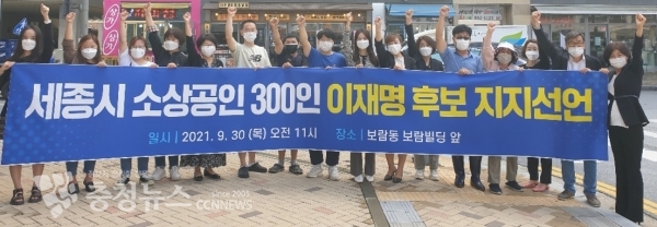 세종특별자치시에서 사업을 영위하는 소상공인 300인이 30일 보람동 중심상업지역내 보람빌딩앞에서, "이재명 후보의 ‘기본소득및 소멸성 지역화폐 지급 공약’과 ‘가맹점, 소상공인 등의 단체결성 및 협상권 부여’에 대한 정책을 적극 지지한다"고 선언했다.