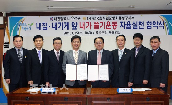 유성구는 27일 구청 중회의실에서 허태정 구청장과 (사)한국음식업중앙회 민병부 유성구지부장 등 양 기관 관계자들이 참석한 가운데 ‘내집․내가게 앞 내가 쓸기운동’ 자율 실천을 위한 협약을 체결했다.